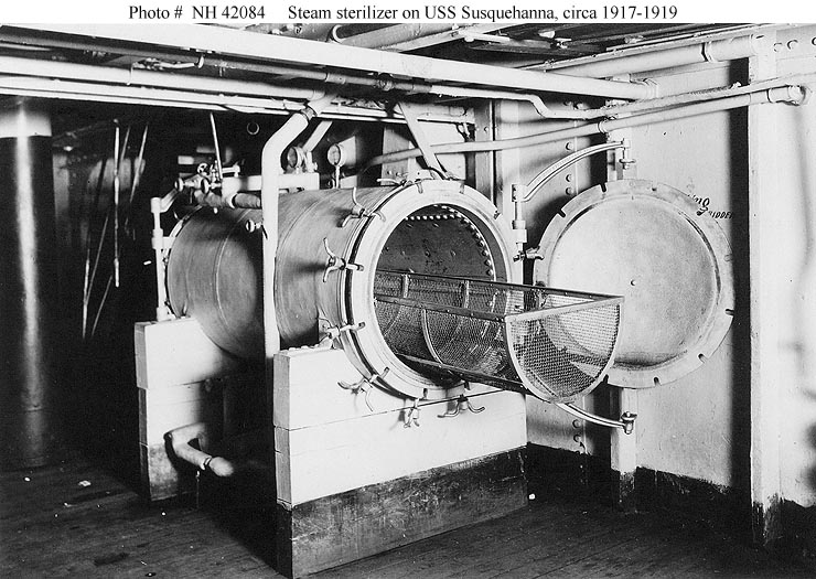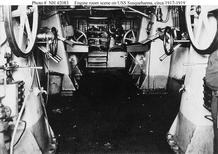 View in the ship's wheelhouse, showing binnacle, steering apparatus
