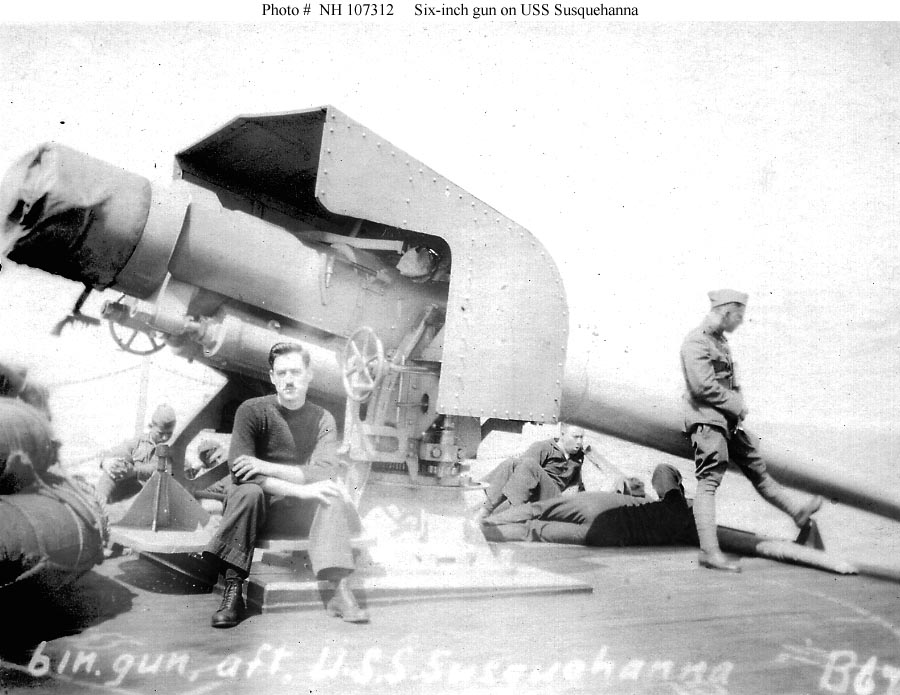 Six-inch gun mounted aft on the ship, with Sailors and Soldiers relaxing nearby, circa 1918-1919.
