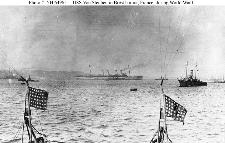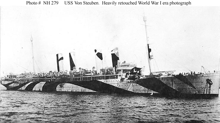 Photo #: NH 279 USS Von Steuben (ID # 3017) Photograph taken circa 1917-18. The image is heavily retouched, with most of the camouflage scheme on the ship painted onto the print. There is no other evidence that this camouflage pattern was actually employed on USS Von Steuben. U.S. Naval Historical Center Photograph. Online Image: 68KB; 740 x 415 pixels |