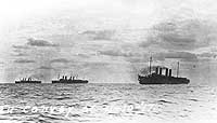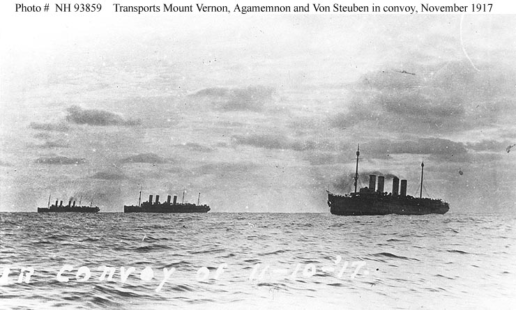 Photo #: NH 93859 U.S. Navy Troop Transports at sea, 10 November 1917 These ships, steaming in convoy from New York City to Brest, France, are (from left to right): USS Mount Vernon (ID # 4508), USS Agamemnon (ID # 3004) and USS Von Steuben (ID # 3017). Note the damage to Von Steuben's bow, the result of a collision with Agamemnon on the previous day. Courtesy of Paul Silverstone, 1982. U.S. Naval Historical Center Photograph. Online Image: 77KB; 740 x 445 pixels |