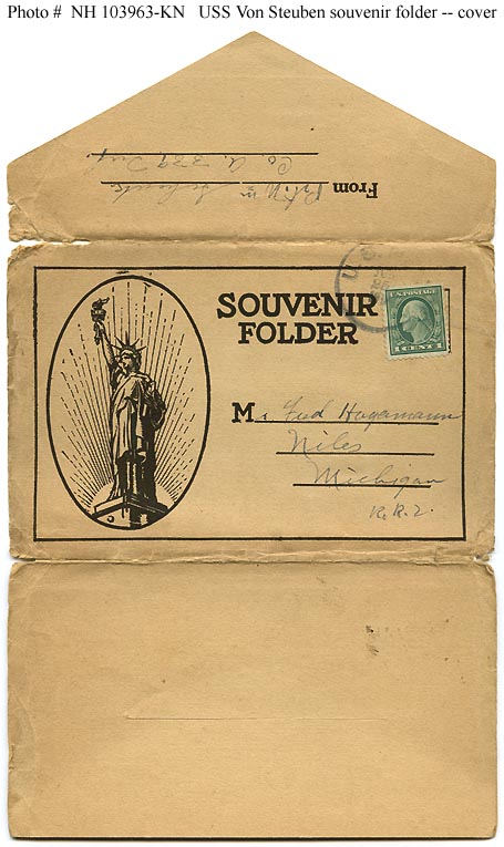 Photo #: NH 103963-KN (color) USS Von Steuben (ID # 3017) Cover of a "Souvenir Folder", published circa 1918-1919, that features ten halftone reproductions of photographs of and on board the ship. Postmarked on 25 June 1919, it was sent by Private William Schenck, Co.A, 339th Infantry, to Mr. Fred Hagermann of Niles, Michigan. Nine of these individual photographs have Photo #s NH 103964, NH 103965, NH 103966, NH 103967, NH 103968, NH 103969, NH 103970, NH 103971 and NH 103972. The other is a halftone reproductions of Photo # NH 97998. The message written on the back of the folder's final photograph is Photo # NH 103973-KN. Donation of Dr. Mark Kulikowski, 2006. U.S. Naval Historical Center Photograph. Online Image: 73KB; 455 x 765 pixels |