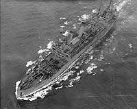 Note the destroyer's after torpedo tubes and wake. Despite being