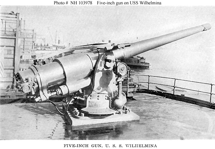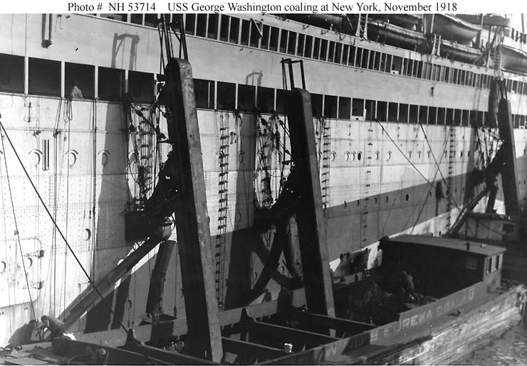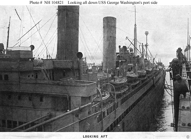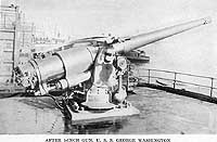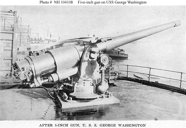 Photo #: NH 104108 USS George Washington (ID # 3018) Halftone reproduction of a photograph identified in the original caption as showing one of the ship's after five-inch guns, circa 1918-1919. It was published in 1919 as one of ten images in a "Souvenir Folder" concerning USS George Washington. Note: An identical photograph was included in a "Souvenir Folder" for USS Wilhelmina (ID # 2168). Identified there as a five-inch gun on that ship, that view is Photo # NH 103978. Donation of Dr. Mark Kulikowski, 2006. U.S. Naval Historical Center Photograph. Online Image: 78KB; 740 x 510 pixels |