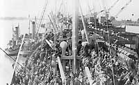 The ship's upper deck is crowded with troops, indicating that