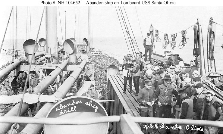 Note lifeboats at right and homeward bound troops on deck.