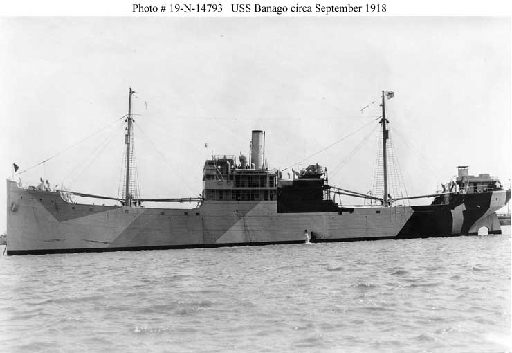 Banago, a 2551 gross ton wooden-hulled freighter, was built at Mobile, Alabama, in 1918 to the Emergency Fleet Corporation's Design 1001, one of over two hundred such ships ordered under the U. S. Shipping Board's World War I emergency shipbuilding program. Upon completion she was sent to New Orleans to fit out for Navy service and was commissioned there on 29 September 1918. USS Banago (ID # 3810) was then ordered to Norfolk to load a cargo of coal, but upon arrival there was found to need extensive repairs. She sailed on 5 November with her cargo but returned to Norfolk the following day because of rudder trouble. In mid-November the ship was towed to New York for drydocking, discharging part of her cargo at Norfolk and part of it at New York. She left the drydock there on 19 December 1918, following a month of repairs, but on 21 December was decommissioned and returned to the U.S. Shipping Board. One of 226 surplus wooden ships sold in a huge single sale in 1922, Banago was scrapped in 1924-25.