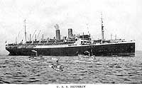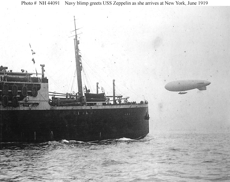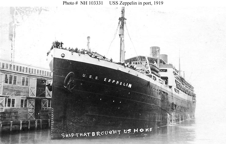 USS Zeppelin, an 21,753 ton transport, was built in 1914 at Vegesack, Germany, as the 15,200 gross ton German flag commercial passenger liner of the same name. She was acquired by the Navy in 1919, and was placed in commission in early March of that year. During the following months she brought nearly 16,000 passengers home from Europe, mainly American World War I veterans. USS Zeppelin was decommissioned in late November 1919 and, a month later, was turned over the the British. She was operated as S.S. Ormuz during much of the following decade.