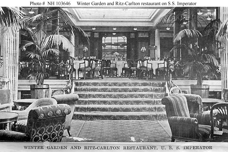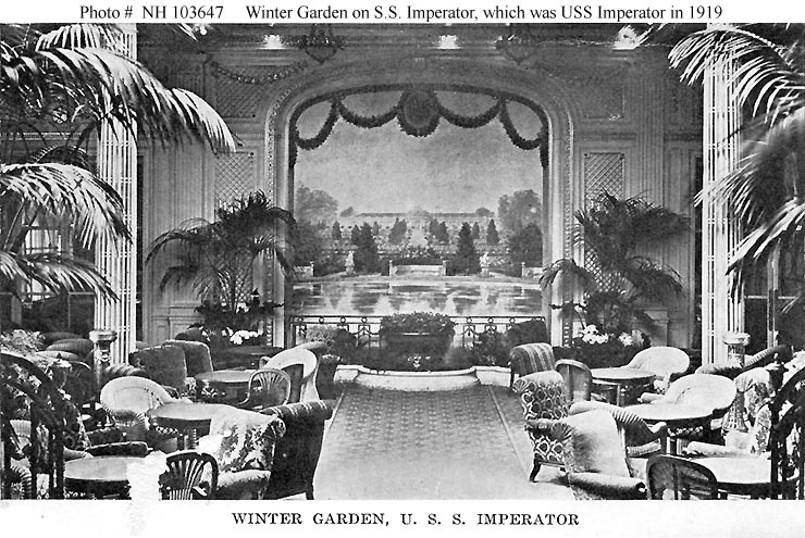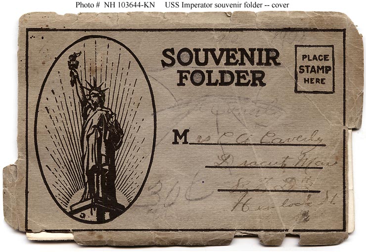 Photo #: NH 103644-KN (color) USS Imperator (ID # 4080) "Souvenir Folder", published in 1919 by A.M. Simon, 324 E. 23rd St., New York City, featuring ten halftone reproductions of photographs of and on board the ship. All of these images were taken circa 1913, when she was the German passenger liner Imperator. The individual photographs have Photo #s NH 103645, NH 103646, NH 103647, NH 103648, NH 103649, NH 103650, NH 103651, NH 103652, NH 103653, and NH 103654. Donation of Dr. Mark Kulikowski, 2006. U.S. Naval History and Heritage Command Photograph. Online Image: 106KB; 740 x 510 pixels |