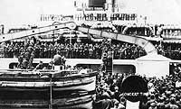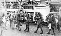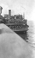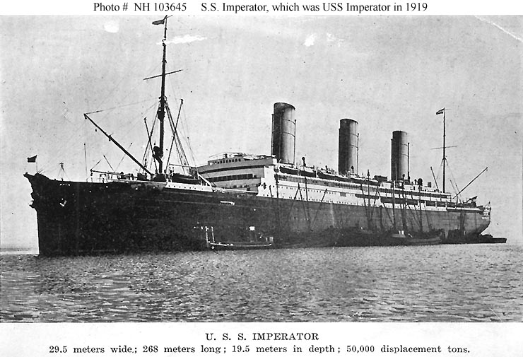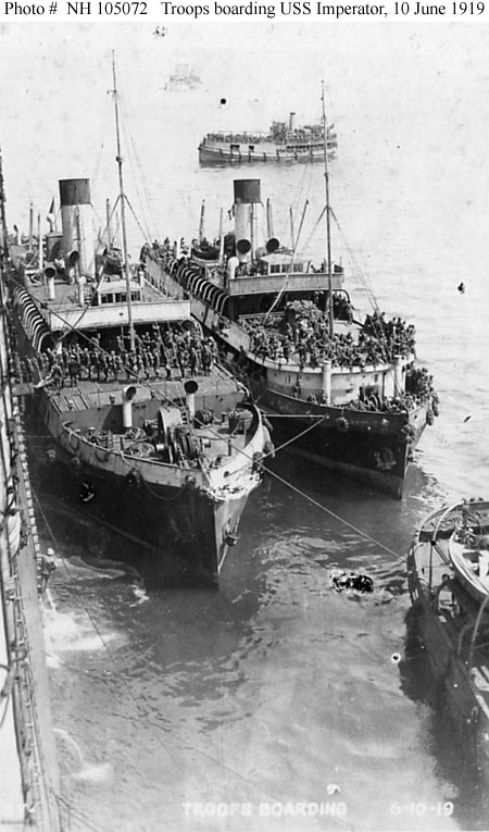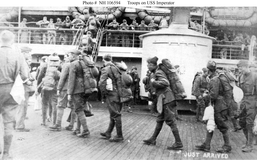 Photo #: NH 106594 USS Imperator (ID # 4080) Troops arriving aboard for passage home to the United States, circa May-August 1919. The original image is printed on post card ("AZO") stock. Donation of Dr. Mark Kulikowski, 2009. U.S. Naval History and Heritage Command Photograph. Online Image: 105KB; 900 x 560 pixels |