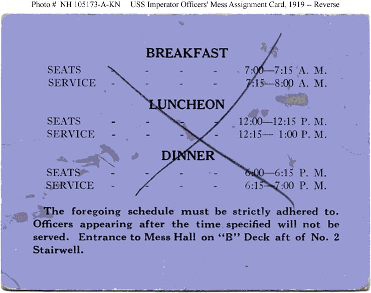 Photo #: NH 105173-A-KN (color) USS Imperator (ID # 4080) Reverse side of an Officers' Mess Assignment Card issued to B. Baildon, during a passage on the ship in 1919. See NH 105173-KN for a view of the front side of this card. Donation of Dr. Mark Kulikowski, 2007. U.S. Naval History and Heritage Command Photograph. Online Image size: 58KB; 740 x 585 pixels |