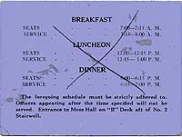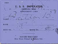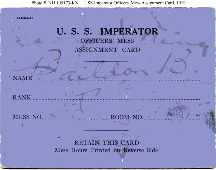 Photo #: NH 105173-KN (color) USS Imperator (ID # 4080) Officers' Mess Assignment Card issued to B. Baildon during a passage on the ship in 1919. See NH 105173-A-KN for a view of the reverse side of this card. Donation of Dr. Mark Kulikowski, 2007. U.S. Naval History and Heritage Command Photograph. Online Image size: 56KB; 740 x 585 pixels |