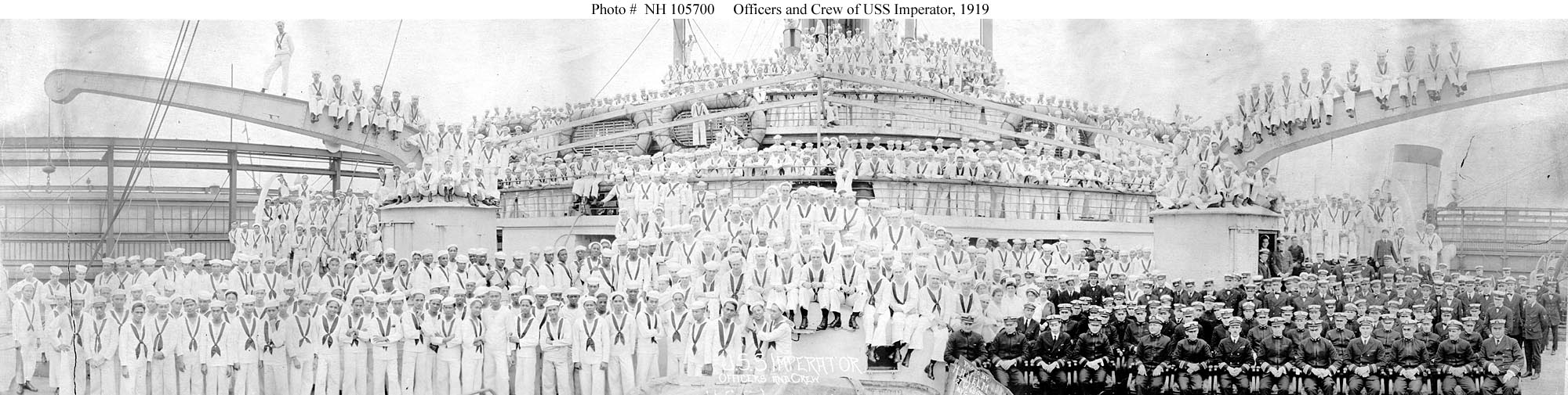 Photo #: NH 105700 USS Imperator (ID # 4080) Ship's Officers and Crew, posed on her after boat deck, circa late spring or summer 1919. Panoramic photograph by H.A. Helm, 121 West 68th Street, New York. Note the large boat cranes flanking this scene, and the very large group of stewards in the front left. Donation of Dr. Mark Kulikowski, 2008. U.S. Naval History and Heritage Command Photograph. Online Image: 212KB; 2000 x 505 pixels |