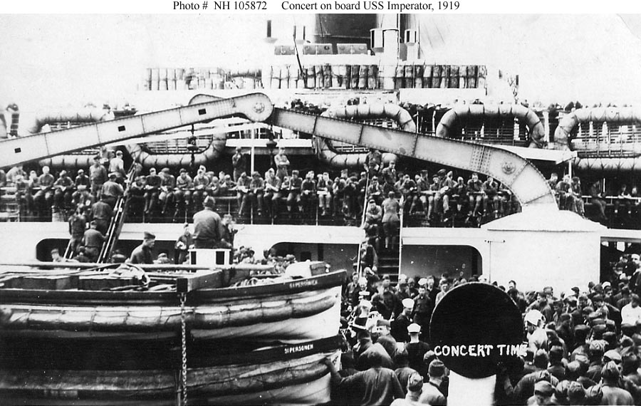 Photo #: NH 105872 USS Imperator (ID # 4080) "Concert Time" on the ship's after boat deck, circa late spring or summer 1919. Note the life boats, life rafts and pair of large boat cranes. The original photograph is printed on post card ("AZO") stock. Donation of Dr. Mark Kulikowski, 2008. U.S. Naval History and Heritage Command Photograph. Online Image: 128KB; 900 x 570 pixels |