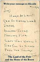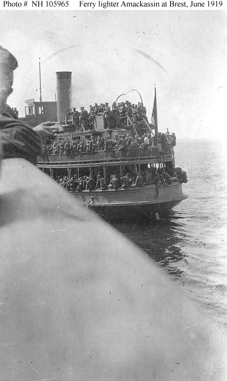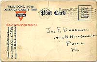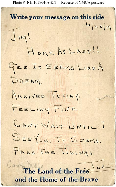 Photo #: NH 105964-A-KN (color) YMCA Ocean Transport Service postcard for returning troops Reverse side, containing a message from Joseph Donahue, of Battery "C", 8th Field Artillery, reporting his arrival after transportation home from France on board USS Imperator (ID # 4080), 20 June 1919. A pencilled notation on the card indicates that he was sent to Camp Albert L. Mills, Nassau County, Long Island, New York, for demobilization. See Photo # NH 105964-KN for a view of the front of this card. Donation of Charles R. Haberlein Jr., 2008. U.S. Naval History and Heritage Command Photograph. Online Image: 85KB; 475 x 765 pixels |