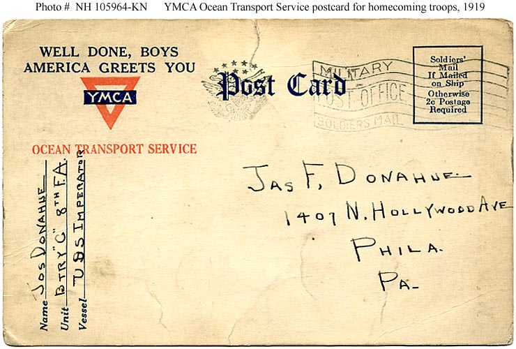Photo #: NH 105964-KN (color) YMCA Ocean Transport Service postcard for returning troops Sent by Joseph Donahue, of Battery "C", 8th Field Artillery, on 20 June 1919, reporting his arrival after transportation home from France on board USS Imperator (ID # 4080). See Photo # NH 105964-A-KN for a view of the reverse of this card, containing Donahue's message. Donation of Charles R. Haberlein Jr., 2008. U.S. Naval History and Heritage Command Photograph. Online Image: 88KB; 740 x 500 pixels |