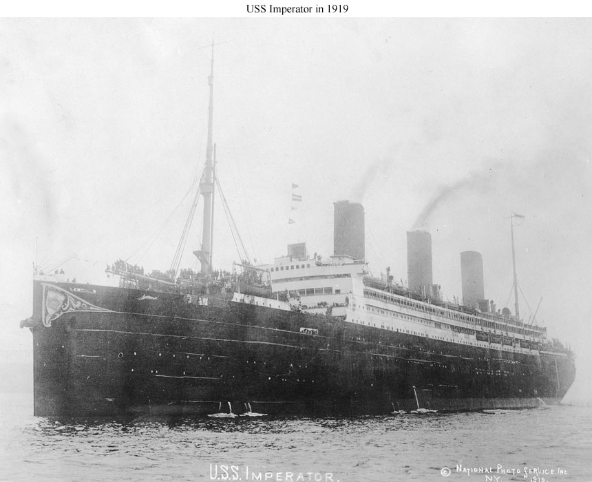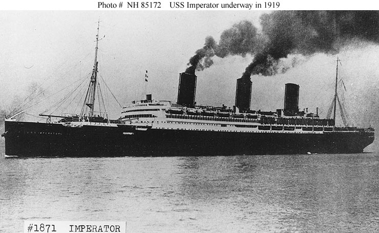 Photo #: NH 85172 USS Imperator (ID # 4080) Halftone reproduction of a photograph showing the ship underway in 1919, while she was employed bringing U.S. service personnel home from Europe. Courtesy of William H. Davis, 1977. U.S. Naval History and Heritage Command Photograph. Online Image: 83KB; 740 x 455 pixels |