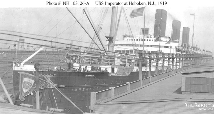 Photo #: NH 103126-A USS Imperator (ID # 4080) At Hoboken, New Jersey, probably after her first trans-Atlantic voyage as a U.S. Navy ship, circa late May 1919. Panoramic photograph by Picot, 15 4th Avenue, Brooklyn, New York. This view is cropped from Photo # NH 103126. Note the large decoration on the ship's bow. Donation of Georgia Adams Grann and Caryl L. Adams, 2005. The original print came from the collection of their father, George W. Adams, who enlisted in the Navy in 1908. U.S. Naval History and Heritage Command Photograph. Online Image: 61KB; 740 x 395 pixels |