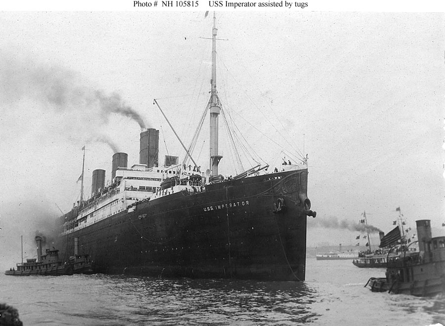 Photo #: NH 105815 USS Imperator (ID # 4080) Assisted by tugs, probably at Hoboken, New Jersey, in mid-1919. Photographed by the Bain News Service, New York City. Donation of Charles R. Haberlein Jr., 2008. U.S. Naval History and Heritage Command Photograph. Online Image: 103KB; 900 x 660 pixels |