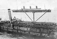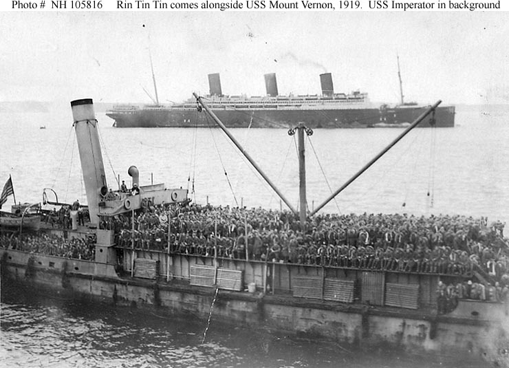 Photo #: NH 105816 Lighter Rin Tin Tin Coming alongside USS Mount Vernon (ID # 4508) to transfer troops for passage home to the United States, in Brest Harbor, France, circa May 1919. USS Imperator (ID # 4080) is in the background. Donation of Charles R. Haberlein Jr., 2008. U.S. Naval History and Heritage Command Photograph. Online Image: 84KB; 740 x 535 pixels |