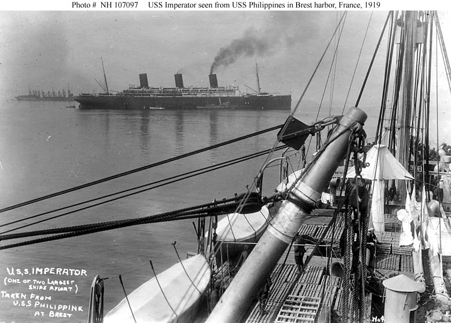 Photo #: NH 107097 USS Imperator (ID # 4080) In Brest Harbor, France, circa June-August 1919. Photographed from on board USS Philippines (ID # 1677). The view looks forward over the port bow from the ship's bridge. Original print from the USS Philippines Collection (Lot S-589-A). Donation of Charles R. Haberlein Jr., 2009. U.S. Naval History and Heritage Command Photograph. Online Image: 122 KB; 900 x 645 pixels |