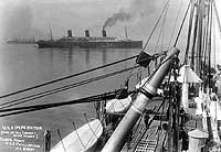 Photo #: NH 103126 USS Imperator (ID # 4080), at left, and USS Leviathan (ID # 1326) At Hoboken, New Jersey, probably after Imperator's first trans-Atlantic voyage as a U.S. Navy ship, circa late May 1919. At that time, these were the World's largest ships, hence the photo's title: "The 'Giants' of the Sea". Panoramic photograph by Picot, 15 4th Avenue, Brooklyn, New York. Note the large decoration on Imperator's bow. Donation of Georgia Adams Grann and Caryl L. Adams, 2005. The original print came from the collection of their father, George W. Adams, who enlisted in the Navy in 1908. U.S. Naval History and Heritage Command Photograph. Online Image: 69KB; 1200 x 280 pixels |