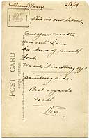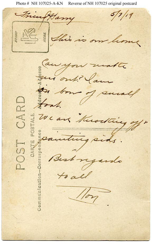 Photo #: NH 107025-A-KN (color) USS Lake Garza (ID # 4086-A) At Swansea, Wales, in 1919. Reverse of the original post card, bearing a hand-written greeting dated 7 May 1919. For a reproduction of the face of the original card, featuring a view of USS Lake Garza, see Photo # NH 107025. Donation of Dr. Mark Kulikowski, 2010. U.S. Naval History and Heritage Command Photograph. Online Image: 110KB; 575 x 925 pixels |