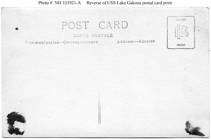 Photo #: NH 103921 USS Lake Gakona (ID # 4409-A) In port with other freighters, circa 1919. The original image was printed on postal card ("K LTD") stock. See Photo # NH 103921-A for a view of the reverse of the original print. Donation of Dr. Mark Kulikowski, 2006. U.S. Naval Historical Center Photograph. Online Image: 72KB; 740 x 585 pixels |