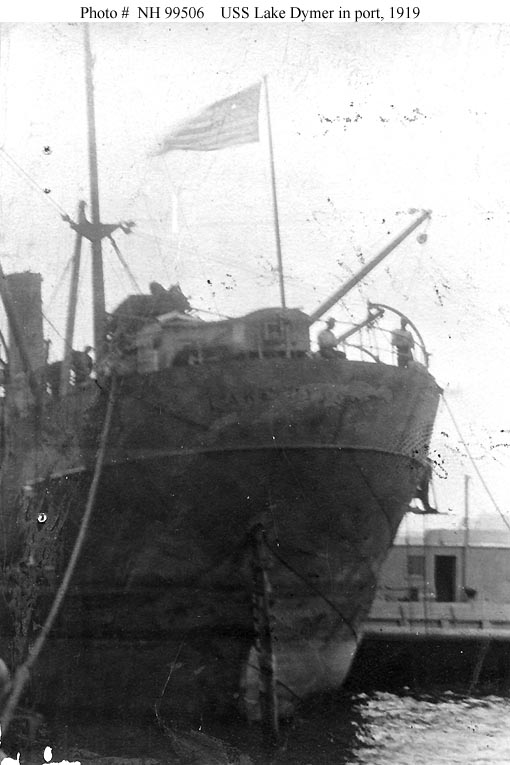 Lake Dymer, a 2357 gross ton freighter, was built at Superior, Wisconsin, in 1918. Taken over by the U.S. Navy and placed in commission as USS Lake Dymer (ID # 4131) in September 1918, she crossed the Atlantic in October. During the next several months, the ship served as a coal carrier between British and French ports. Soon after her return to the United States in June 1919, USS Lake Dymer was decommissioned and returned to the U.S. Shipping Board. She was sold for scrap in 1926.
