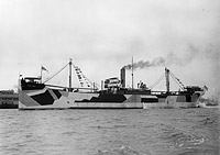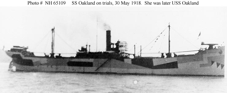 Oakland, a 6002 gross-ton steamship, was built in 1918 at Oakland, California. Originally named War Breeze and intended for British owners, she was taken over by the United States Shipping Board and, upon completion, turned over the the U.S. Navy. Commissioned in early June 1918 as USS Oakland (ID # 2847) and assigned to the Naval Overseas Transportation Service for cargo ship duty, she intially transported flour to New York. Between September 1918 and May 1919, the ship made two round-trip voyages from the U.S. to Italy, then was decommissioned and returned to the Shipping Board. She was abandoned in 1933.