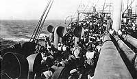 Photo #: NH 41878 USS President Lincoln (1917-1918) Troops on deck, wearing life jackets, as the transport passed through the submarine zone en route to France. A hand-written inscription on the reverse of the original print for Photo # NH 41875 (taken at the same time as this one) dates this photo in October 1917 and identifies the troops as part of the Rainbow Division. View looks aft from the ship's forecastle. U.S. Naval Historical Center Photograph. Online Image: 98KB; 740 x 455 pixels |