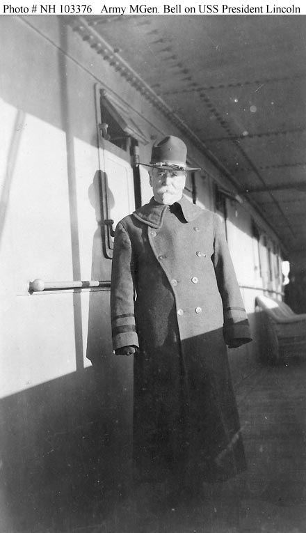 Photo #: NH 103376 USS President Lincoln (1917-1918) A U.S. Army General Officer on board the ship, 1917. A hand-written inscription on the back of the original print identifies him as "Major General Bell". He may be Major General James Franklin Bell, former Army Chief of Staff. Courtesy of the Naval Historical Foundation, Washington, D.C. - USS President Lincoln Collection. U.S. Naval Historical Center Photograph. Online Image: 44KB; 440 x 765 pixels |