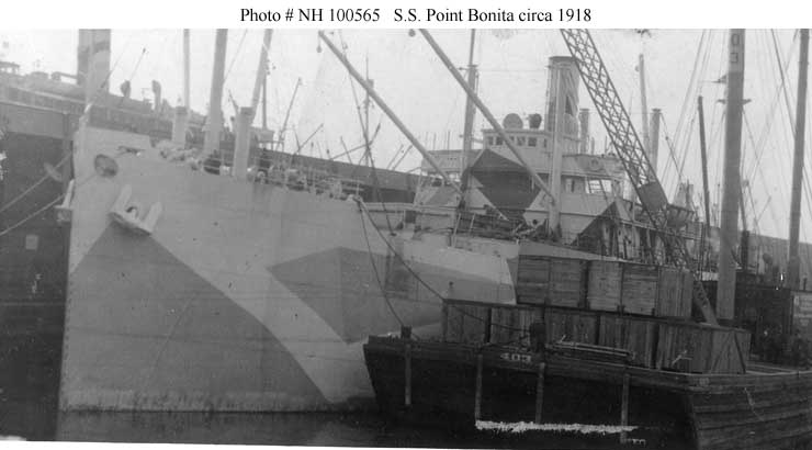 Point Bonita, a 2675 gross ton (4075 tons displacement) freighter built at Portland, Oregon, was completed in June 1918. Commissioned in the Navy on 7 October 1918 as USS Point Bonita (ID # 3496), she sailed in mid-October with a convoy for Nantes, France, arrived there in early November and returned to New York in mid-December. The ship then loaded a partial cargo for the U.S. Shipping Board before moving to Norfolk, Virginia, to load coal for the use of Naval ships operating in the Hawaiian area. Sailing in early January 1919, she delivered her cargo at Pearl Harbor in February and returned to New York at the end of March. Point Bonita was decommissioned there on 7 April 1919 and returned to the Shipping Board.