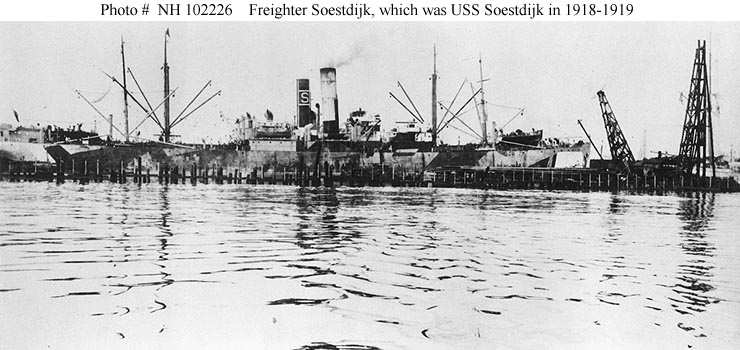 Soestdijk, a 6445 gross ton freighter, was built at West Hartlepool, England, in 1901 for Dutch owners. She was seized by the U.S. Government in March 1918, turned over to the Navy and commissioned late in that month as USS Soestdijk (ID # 3413). Serving with the Naval Overseas Transportation Service (NOTS), she was mainly employed to carry coal, manganese ore and other materials between Brazil and the U.S. East Coast. In June 1919 the ship crossed the Atlantic to Europe with a shipment of food. After delivering her cargo at Göteborg, Sweden, Soestdijk went to Rotterdam, where she was decommissioned in mid-July and returned to her owner.