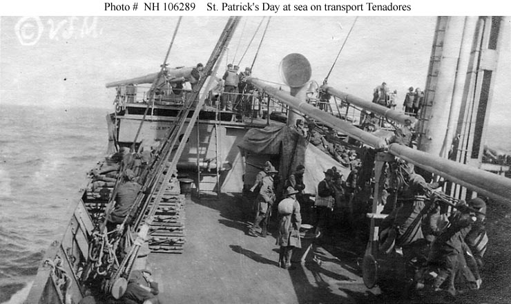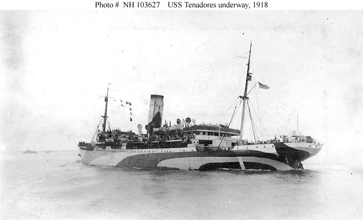 USS Tenadores, a 10,000 ton (displacement) troop transport, was built in 1913 at Belfast, Ireland, for the United Fruit Company of New York as the 7782 gross ton passenger-cargo steamer of the same name. She was taken over by the Navy in April 1918 and placed in commission at that time. During the rest of World War I she was employed taking American troops across the Atlantic to the European war zone. Following the 11 November 1918 Armistice she reversed the flow, bringing home more than 1600 veterans of the "Great War". On 28 December 1919, while approaching Brest, France after a voyage from New York, Tenadores ran aground in a fog. Though all on board were rescued, the ship could not be saved and was soon broken up by the sea.