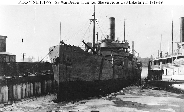 War Beaver, a 2028 gross ton steam cargo ship, was built at Detroit, Michigan, in 1917. She was renamed Lake Erie by the United States Shipping Board soon after completion, and at the end of December 1917 was taken over by the Navy. Commissioned as USS Lake Erie (ID # 2190) in January 1918, she operated for a few months as a collier along the U.S. east coast. Beginning in April 1918, she made four round-trip voyages to Europe, carrying general cargo and mines for use in establishing anti-submarine barriers. Sunk in a collision in Welsh waters on 16 January 1919, Lake Erie was raised in August and sold in November 1919. She was named Gezina, Ragni, Arpeco and Force during her lengthy subsequent merchant service. The old ship was finally scrapped in 1959.