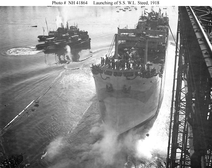 S.S. W.L. Steed, a 6450 gross ton (13,000-tons displacement) oil tanker, was built at Quincy, Massachusetts, as part of the World War I shipbuilding effort. Transferred to the Navy upon completion, she was placed in commission on 18 September 1918 as USS W.L. Steed (ID # 3449) and assigned to the Naval Overseas Transportation Service. Problems with her steering gear aborted her first attempt to carry oil across the Atlantic to England, and she was still in American waters when the 11 November Armistice brought the war's combat phase to an end. Following repairs, W.L. Steed completed one voyage to France and had a second prematurely ended by damage. She was decommissioned in late March 1919 and returned to the U.S. Shipping Board.