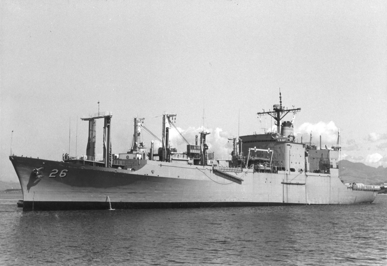 This, the first preliminary design for an AE in the Fiscal Year 1965 building program, was based on the Maritime Administration's Mariner C4 cargo ship and generally resembled the FY 1961 Mars (AFS 1) class. Between the production of this design in April 1963 and the approval of the final characteristics for the AE 26 class in March 1964 the layout of the design was radically altered.