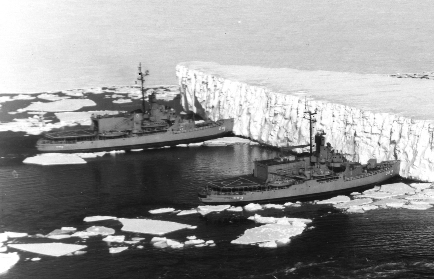 Atka with USS Burton Island (AGB 1) to port and USS Glacier (AGB 4) out of the frame to starboard pushing together to move a huge iceberg from the channel to McMurdo Station, Antarctica, on New Year's Eve (31 December) 1965 during that year's Operation Deep Freeze. Significant modifications to the two older ships included large helicopter hangars and climate-controlled ship control and lookout stations just under their AN/SPS-6 radar antennas. Atka had received a helo hangar at NSY Boston around March 1965 but did not get the control station until later.