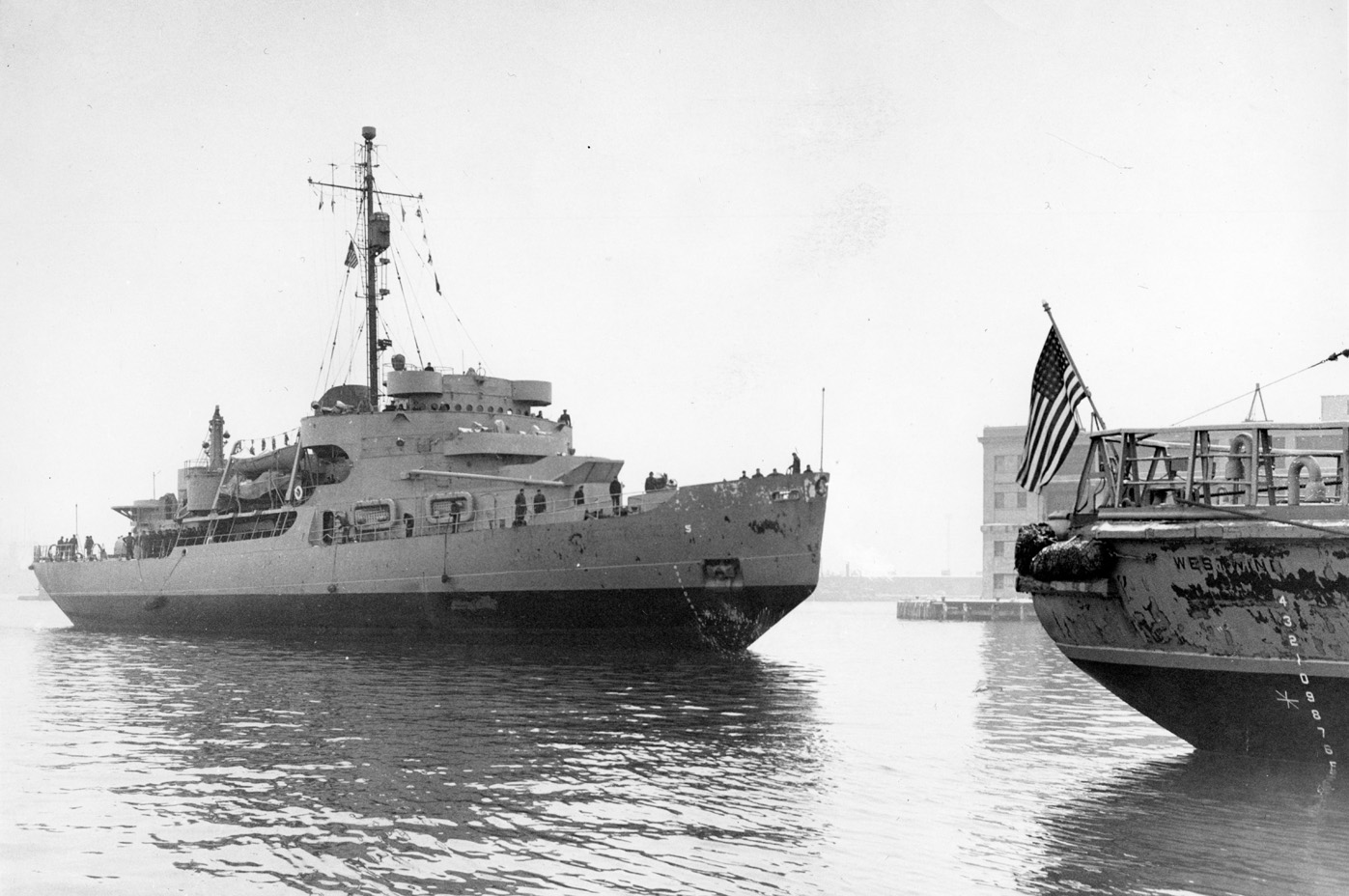 Approaching a pier, probably in December 1951 at Bremerhaven, Germany, without armament, flying the U.S. flag, and with a small "5" on the bow. Her sister Westwind (AGB 6) is pierside on the right with her flag and her name on the stern.