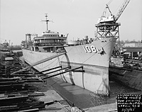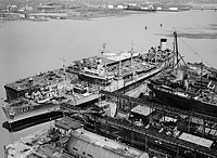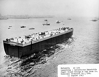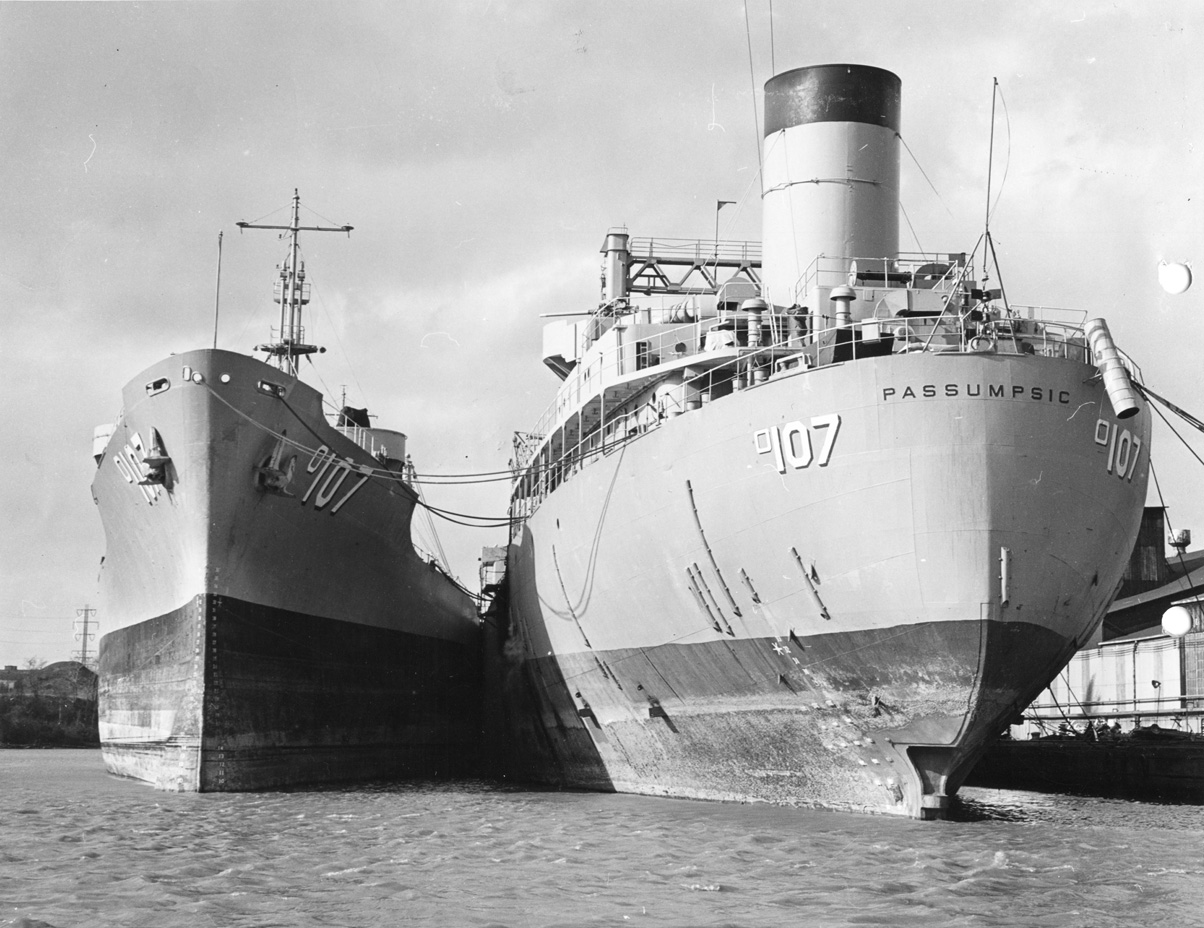 Navasota's new midbody being launched at the Kawasaki Dockyard Co., Kobe, Japan, on 11 August 1963. The midbody was then towed to the Puget Sound Bridge & Dry Dock Co., Seattle, Wash., where it was used in the tanker's "Jumbo" conversion. The same process was used for Waccamaw.