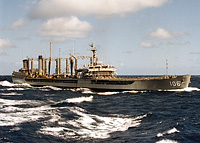 Underway in February 1991 during exercises off the coast of southern California. The single fueling station forward of the bridge was removed from this class at around this time to clear more room on the bow for helicopter operations.