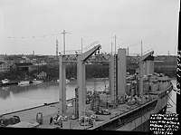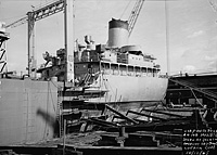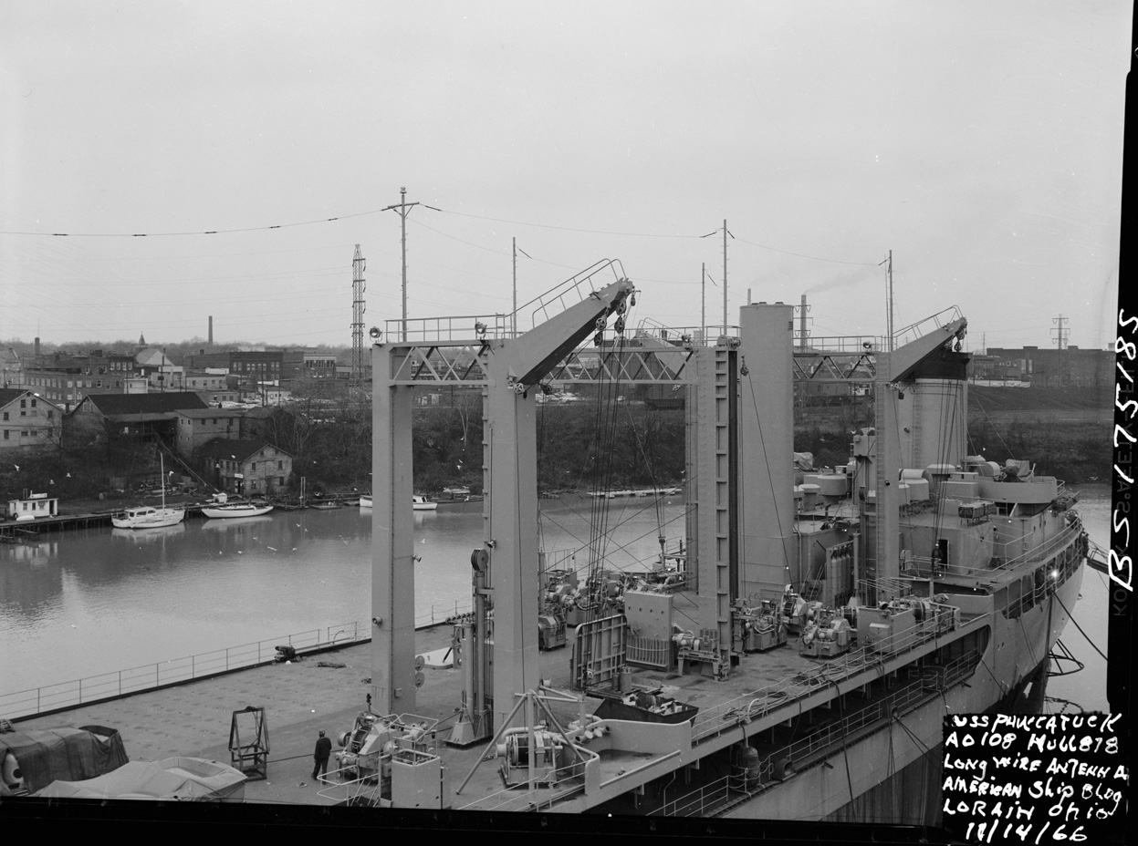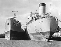 Mispillion's new midbody, built at the conversion yard at Lorain, Ohio, moored alongside the original ship. The new cargo deck is in place aft of the transverse beams that were to receive the midship house but not forward of them. This and the following five images relate to the three conversions at Lorain, including Pawcatuck and Passumpsic. Note that Mispillion lacked the reinforced fueling goalpost mast aft that her sisters got.