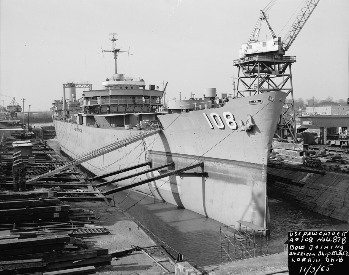 Pawcatuck's stern being joined to the new midbody on 12 October 1965. Note the retention of the old after refueling goalpost mast.