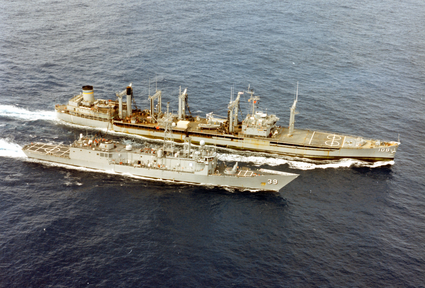 Replenishing USS Doyle (FFG 39) in the Atlantic at the equator on 9 October 1990. Note the reapparance of the large bow hull number on the MSC ship.