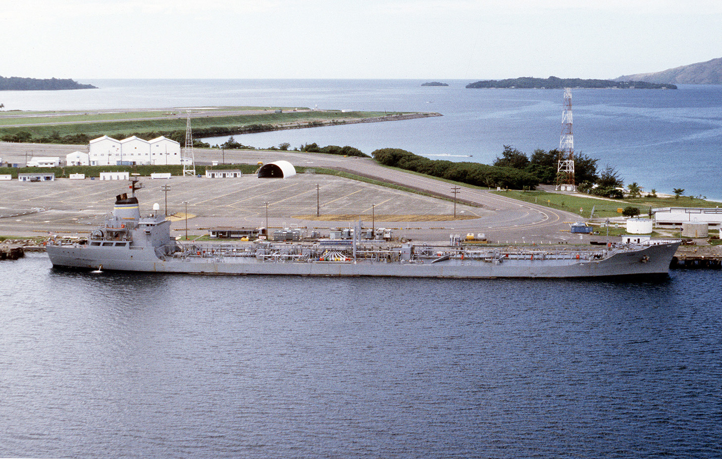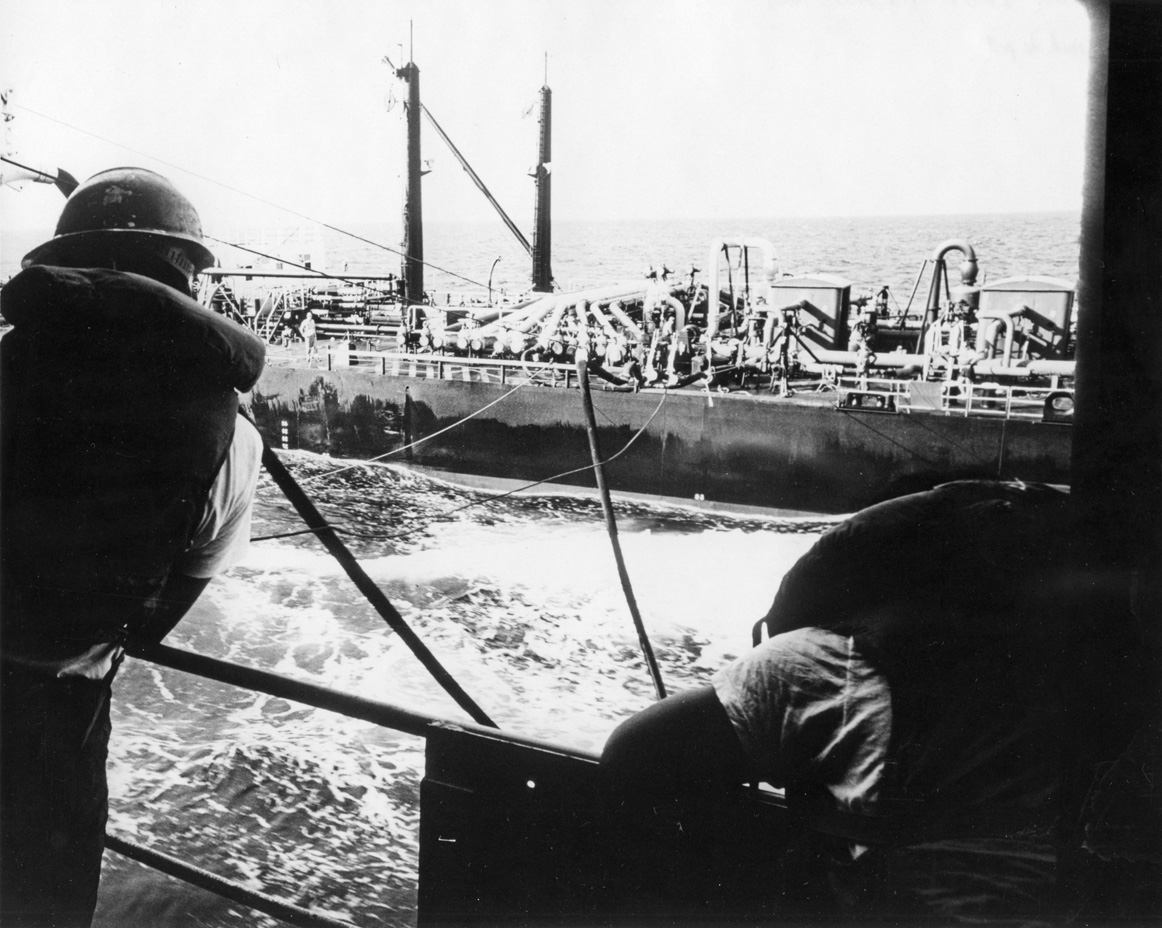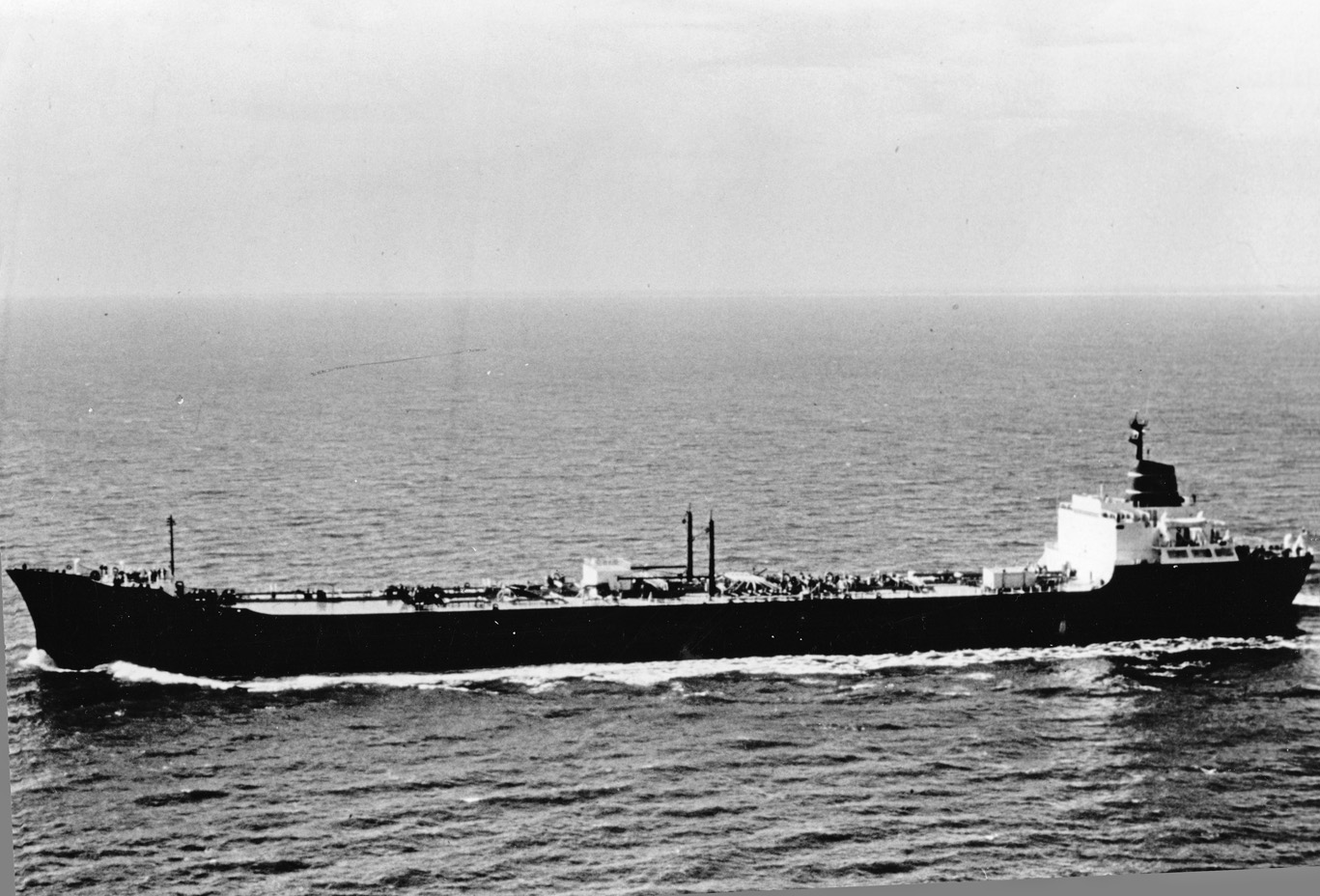 Because of problems associated with the Arab Oil Embargo of 1973, USS Blue Ridge (LCC 19) during a transit from Singapore to Okinawa between 29 August and 4 September 1973 became the first Seventh Fleet combatant ship to refuel at sea with a commercial tanker, taking on some 158,000 gallons of Navy distillate from MV Falcon Princess. The tanker is wearing Falcon Tankers stack markings. She was renamed USNS Hudson (T-AO 184) in 1976.